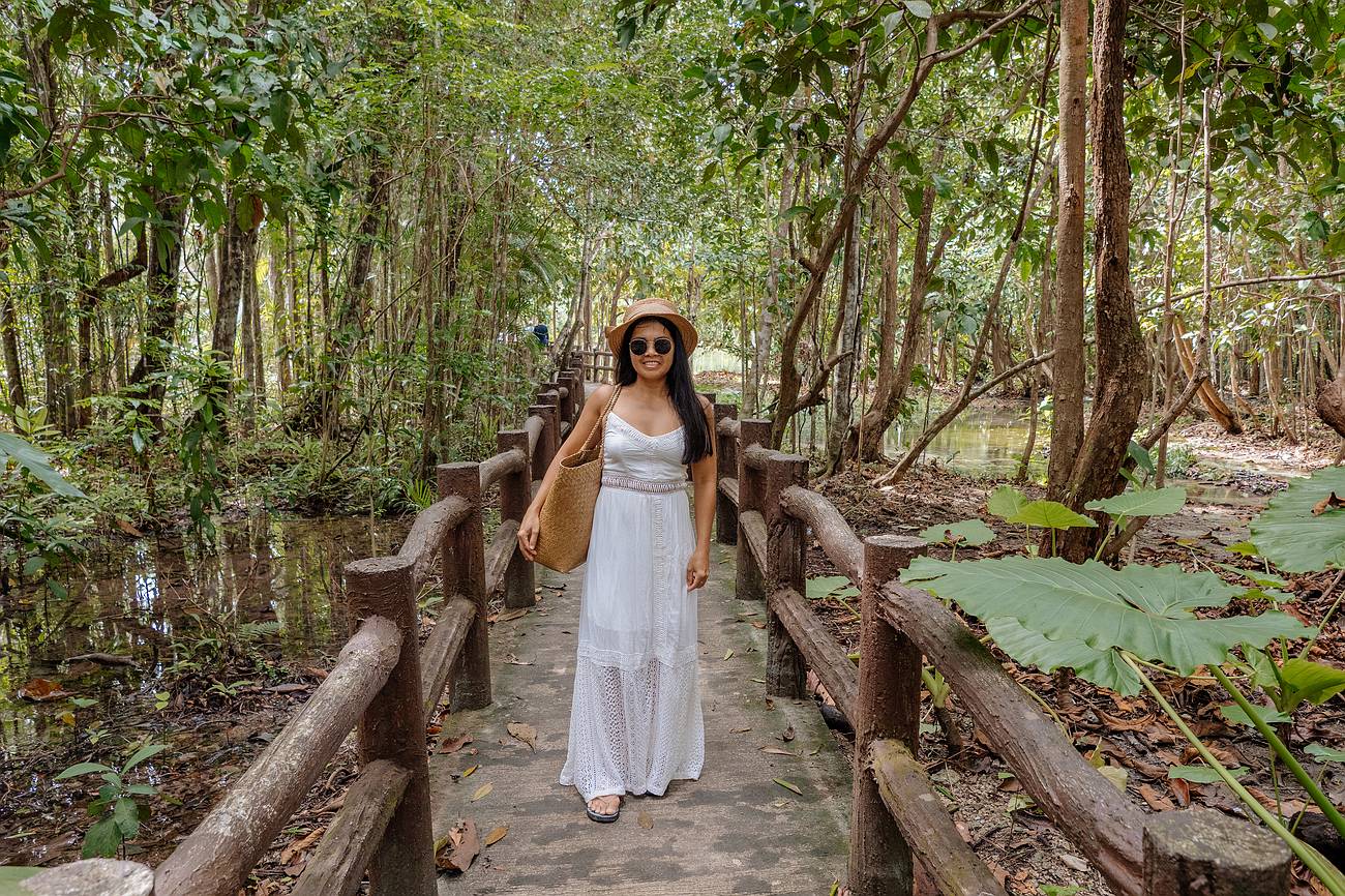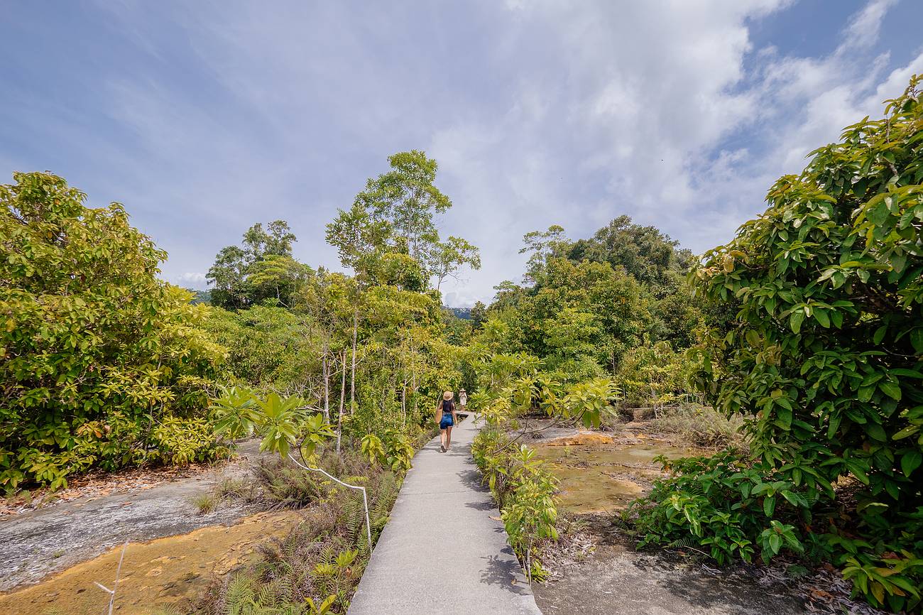 Empfehlenswerter ist der längere Naturpfad, der kurz nach dem Eingang rechts abzweigt. Diese Strecke ist rund 1,4 Kilometer lang und dauert etwa 20 Minuten – je nachdem, wie oft du unterwegs stehen bleibst, um das Dschungelflair zu genießen. Hier schlängelt sich ein hölzerner Steg durch den Regenwald, vorbei an klaren Quellen, Mangroven, kleinen Flüssen und mit etwas Glück auch Tieren. Der Weg ist nicht beschwerlich und bietet deutlich mehr Eindrücke der abwechslungsreichen Landschaft. Außerdem passierst du unterwegs den oft übersehenen Crystal Pool, der sich für eine kurze Pause anbietet.