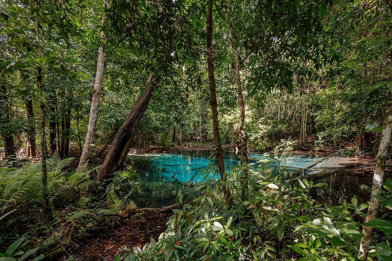 Etwa einen Kilometer vom Emerald Pool entfernt findest du den geheimnisvollen Blue Pool. Dieser natürliche Quellsee beeindruckt mit seinem intensiven, tiefen Blau, das fast schon surreal wirkt. Der Blue Pool ist von dichter Vegetation umgeben und erscheint wie aus einer anderen Welt. Wichtig: Im Blue Pool ist das Baden streng verboten – das empfindliche Ökosystem soll unbedingt geschützt werden.