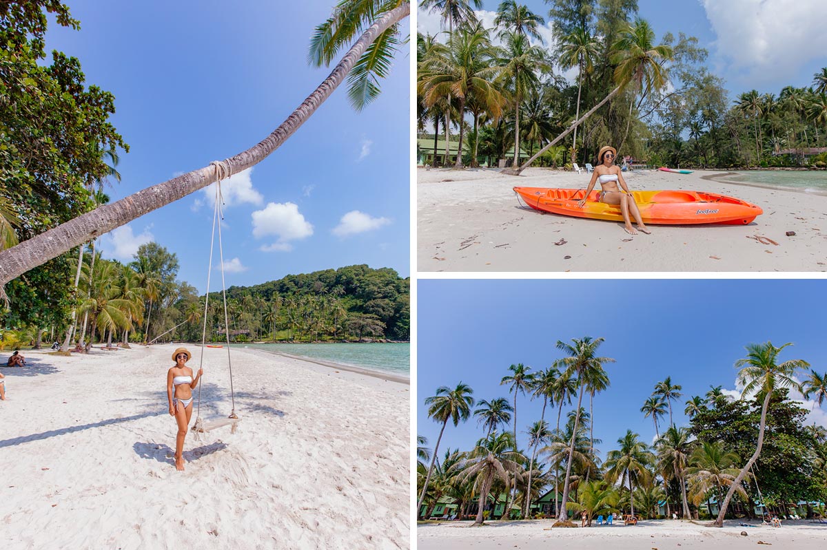 Ein Highlight sind die Schaukeln an den Palmen, die mit Blick aufs türkisfarbene Meer zum Entspannen einladen. Vor Ort kannst du Kajaks mieten, um die Küste zu erkunden und versteckte Buchten zu entdecken.