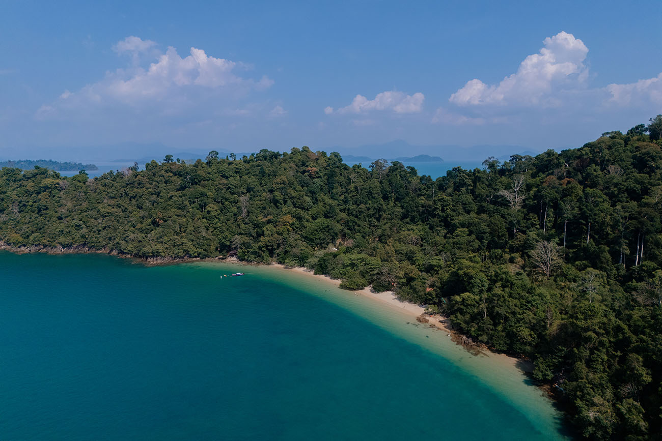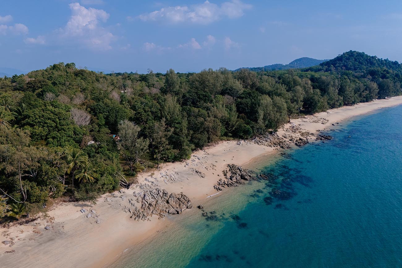 Der Name bedeutet übersetzt so viel wie „weißer Felsenstrand“, doch spektakulär ist er nicht. Der Strand ist naturbelassen und ruhig, der Sand weitläufig – wie das Drohnenfoto zeigt, zieht er sich in einer langen, sanften Kurve entlang des dichten Dschungels. Das Wasser ist bei Ebbe sehr flach und nicht besonders klar. Wer einen Badestrand mit türkisblauem Wasser sucht, ist hier falsch. Wer dagegen Einsamkeit und Natur schätzt, findet hier seinen Moment der Stille.