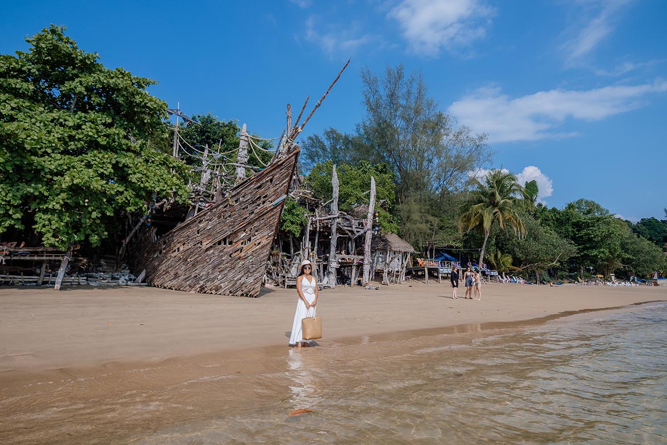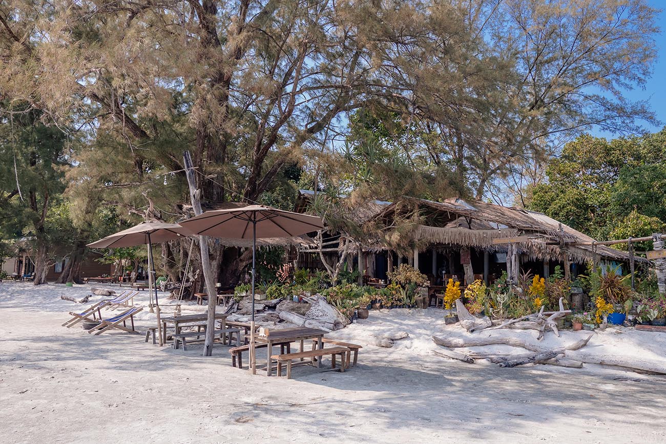 Der südliche Teil überzeugt mit feinem, hellem Sand und kristallklarem Wasser in sattem Blaugrün. Die Bucht ist ruhig und kaum frequentiert – ideal zum Entspannen und für ausgedehnte Strandspaziergänge. Bei Ebbe zieht sich das Wasser hier jedoch sehr weit zurück, sodass Schwimmen nur möglich ist, wenn du weit ins Meer hinausläufst. Ein absolutes Highlight ist die Rock Bar – eine urige Strandbar, die sich spektakulär auf Felsen direkt über dem Wasser erstreckt. Verbunden durch einen rustikalen Holzsteg, thront sie mit strohgedeckten Dächern und einem weiten Blick über die Bucht. Hier gibt es Cocktails, Kaffee, frische Fruchtsäfte, Seafood und Thai Food – alles mit Meerblick, der seinesgleichen sucht.