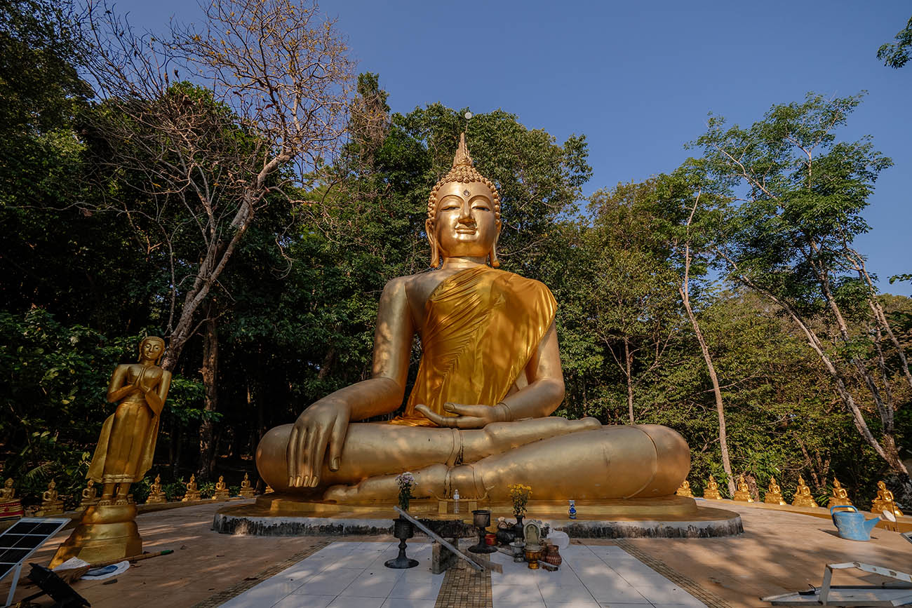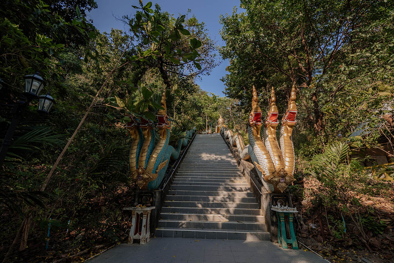 Auf der einen Seite führt eine beeindruckende Steintreppe, flankiert von goldenen Naga-Schlangenskulpturen, hinauf durch den Dschungel zu einer großen, strahlend goldenen Buddha-Statue. Ringsum haben sich zahlreiche kleinere Buddha-Figuren in einem Kreis versammelt – eine stille, feierliche Atmosphäre, die einen unweigerlich innehalten lässt.