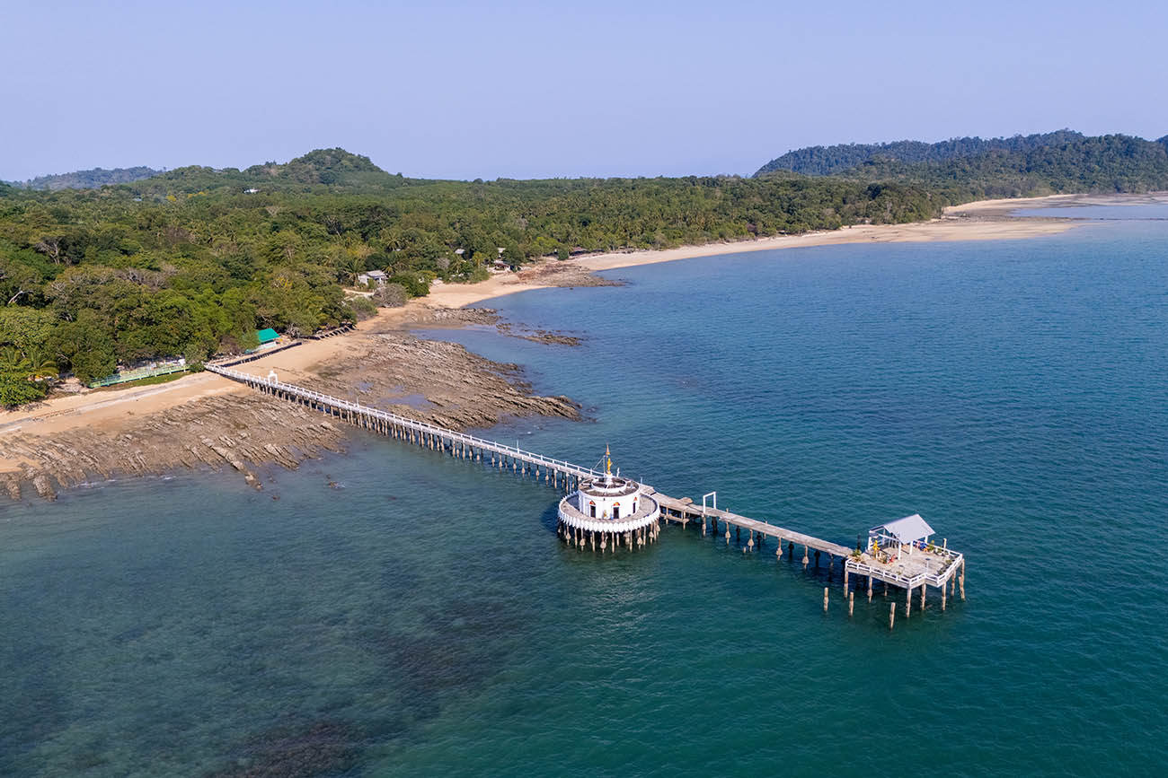 Ao Mae Mai liegt an der Ostseite der Insel und ist gleichzeitig der Standort des Hauptpiers von Koh Phayam – der erste Ort also, den die meisten Besucher beim Ankommen mit der Fähre zu Gesicht bekommen. Rund um den Pier findest du Unterkünfte, kleine Läden, Fahrradverleih und Motorradtaxi-Services – die beste Infrastruktur, die die Insel zu bieten hat. Am Ende des Strandes, am Fuß eines bewaldeten Hügels direkt am Wasser, befindet sich der Wat Ko Phayam – ein stimmungsvoller Tempel, der die Bucht still bewacht.