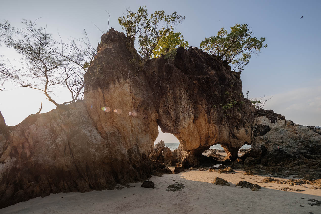 Hin Talu (หินทะลุ) – übersetzt „durchbohrter Felsen“ – ist ohne Zweifel das beeindruckendste Naturschauspiel auf Koh Phayam. Was Wind und Wellen über viele Jahrtausende geschaffen haben, ist heute das ikonischste Fotomotiv der Insel: eine mächtige Felsformation mit einem natürlichen Torbogen und einer weitläufigen Höhle mit mehreren Durchblicken – wie Fenster, durch die das Meer hindurchschimmert.
