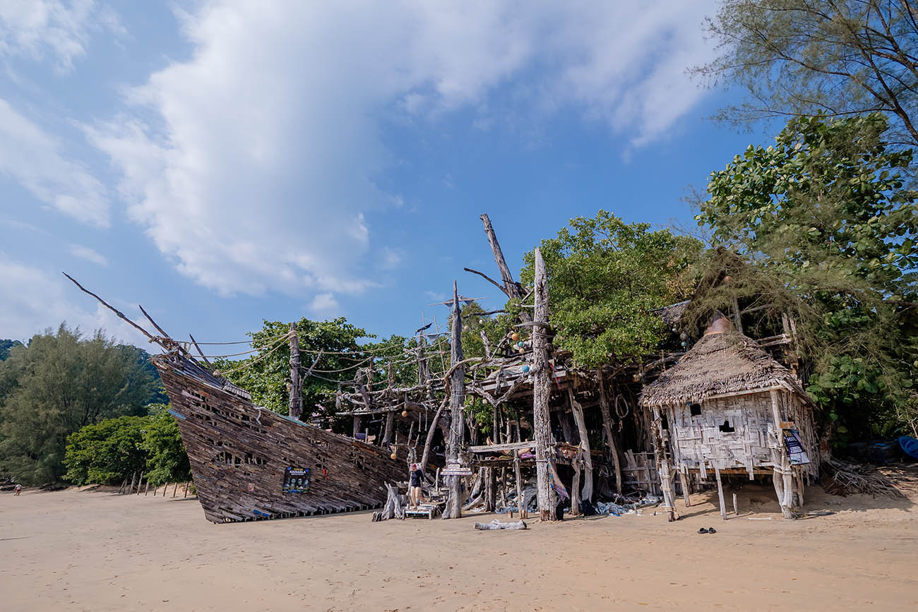 Der nördliche Teil der Bucht hat zwar etwas grobkörnigeren Sand, punktet dafür aber mit tieferem Wasser – hier ist Schwimmen auch bei Ebbe problemlos möglich. Abends verwandelt sich dieser Strandabschnitt in einen der stimmungsvollsten Orte der Insel, wenn die Sonne direkt vor dir im Meer versinkt. Mittendrin liegt die legendäre Hippie Bar – ein Ort, der auf Koh Phayam Kultstatus hat. Das weithin sichtbare Wahrzeichen der Bar ist ein riesiges, schiffähnliches Kunstwerk aus Treibholz und alten Holzbalken, das direkt am Strand steht und aus der Ferne wie ein gestrandetes Piratenschiff wirkt. Drumherum: Lichterketten, Hängematten, entspannte Musik und eine herzliche Atmosphäre, die Reisende aus aller Welt anzieht. Wer hier einmal den Sonnenuntergang erlebt hat, kommt wieder.