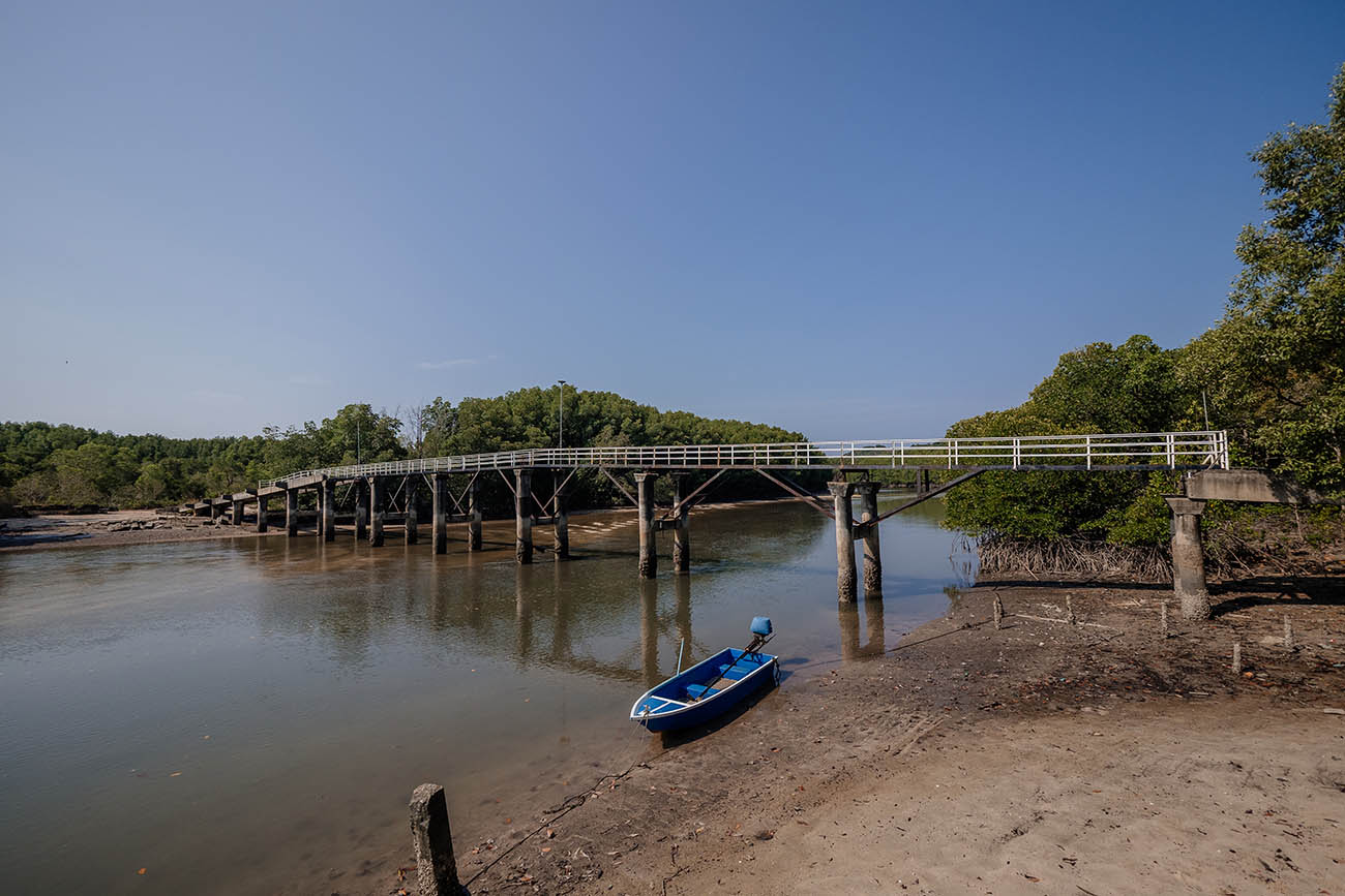 Ein ganz besonderer Ort auf Koh Phayam ist das kleine Moken Village, das du über eine schmale Brücke erreichst, die sich durch die Mangroven zieht. Hier scheint die Zeit ein wenig stehen geblieben zu sein: einfache Stelzenhäuser, kleine Boote im flachen Wasser und eine ruhige, ursprüngliche Atmosphäre. Direkt am Eingang findest du die Bobby Bar, wo du nicht nur entspannt etwas trinken kannst, sondern auch Kajaks ausleihen kannst, um die Umgebung vom Wasser aus zu erkunden.