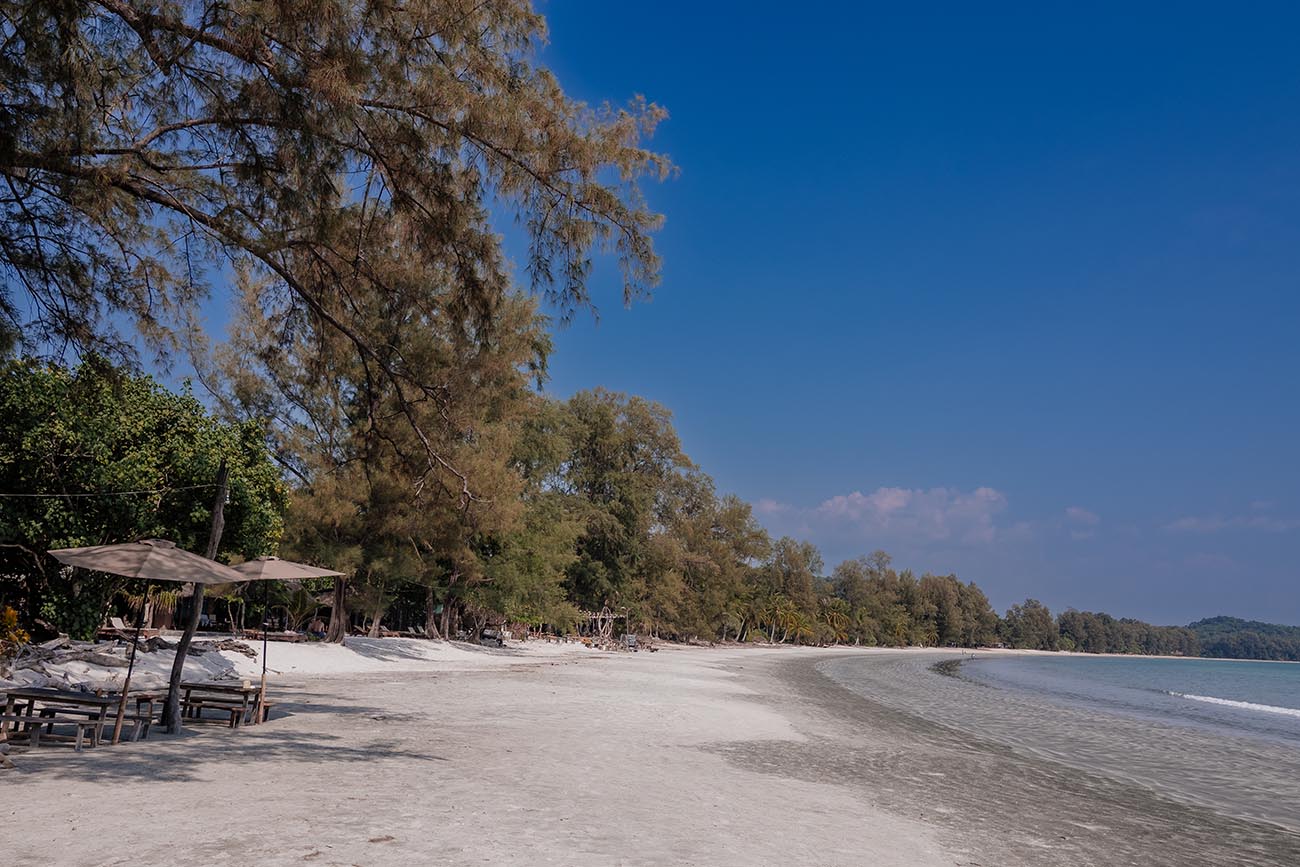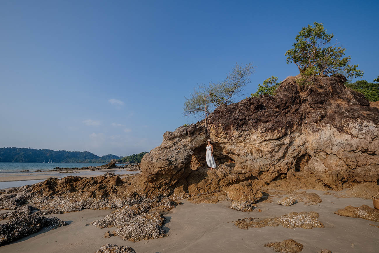 Der Name bedeutet übersetzt so viel wie „weißer Felsenstrand“, doch spektakulär ist er nicht. Der Strand ist naturbelassen und ruhig, der Sand weitläufig – wie das Drohnenfoto zeigt, zieht er sich in einer langen, sanften Kurve entlang des dichten Dschungels. Das Wasser ist bei Ebbe sehr flach und nicht besonders klar. Wer einen Badestrand mit türkisblauem Wasser sucht, ist hier falsch. Wer dagegen Einsamkeit und Natur schätzt, findet hier seinen Moment der Stille.