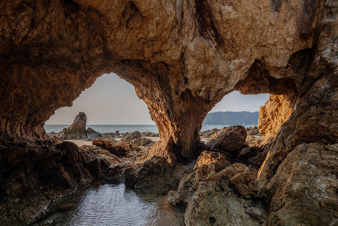 Hin Talu (หินทะลุ) – übersetzt „durchbohrter Felsen“ – ist ohne Zweifel das beeindruckendste Naturschauspiel auf Koh Phayam. Was Wind und Wellen über viele Jahrtausende geschaffen haben, ist heute das ikonischste Fotomotiv der Insel: eine mächtige Felsformation mit einem natürlichen Torbogen und einer weitläufigen Höhle mit mehreren Durchblicken – wie Fenster, durch die das Meer hindurchschimmert.