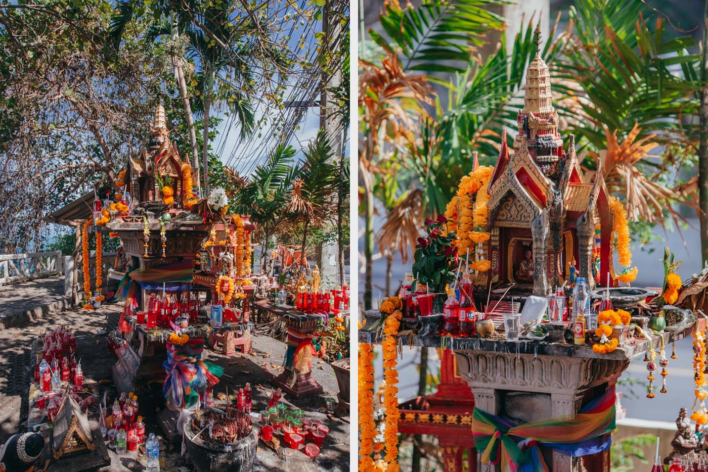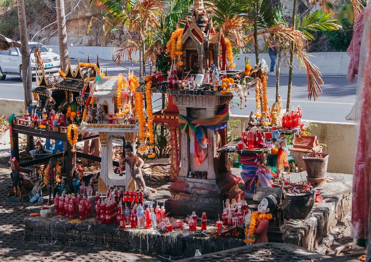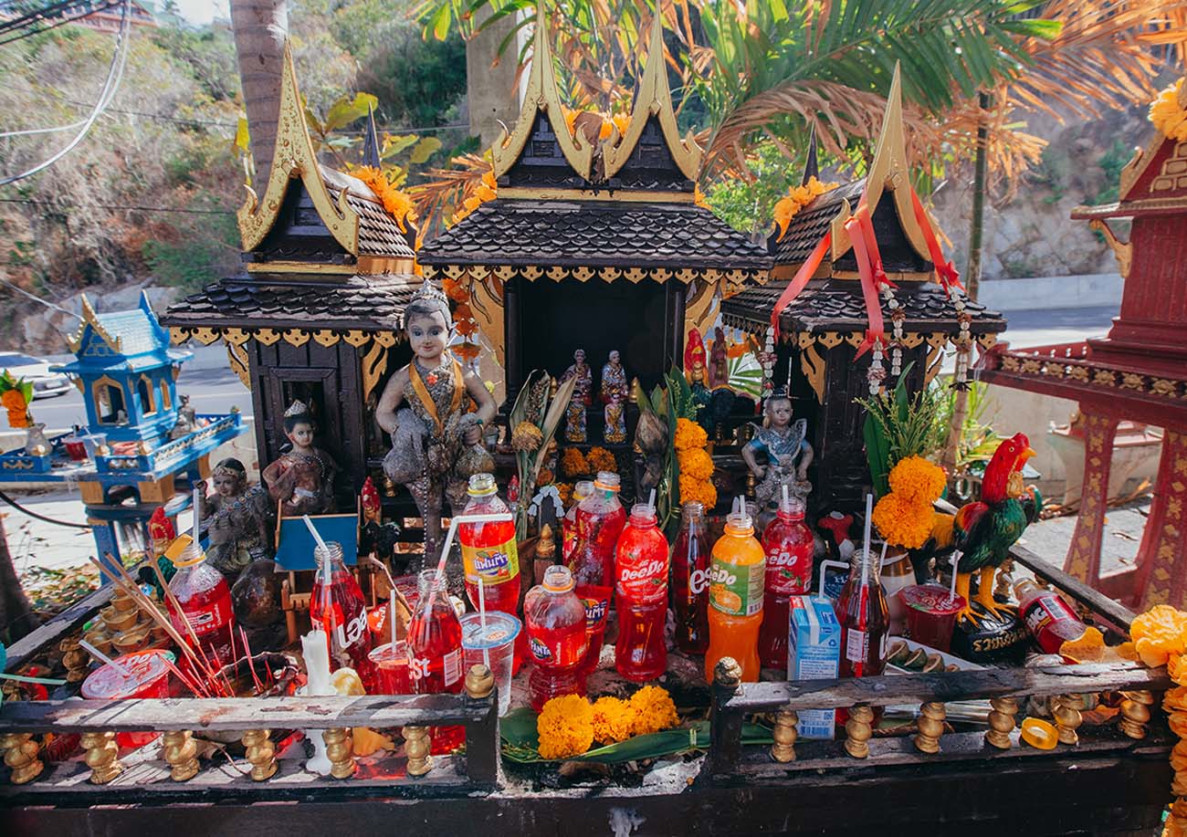 Besonders auffällig ist die rote Limonade, die man an vielen Schreinen sieht. Sie gilt als Lieblingsgetränk bestimmter Geister und hat sich fest in die Tradition eingebrannt. Ebenso beliebt sind Spielzeugautos, Elefantenfiguren, Hähne, Tänzerinnen oder goldene Statuetten, die als Zeichen von Dankbarkeit oder Bitte dienen.
